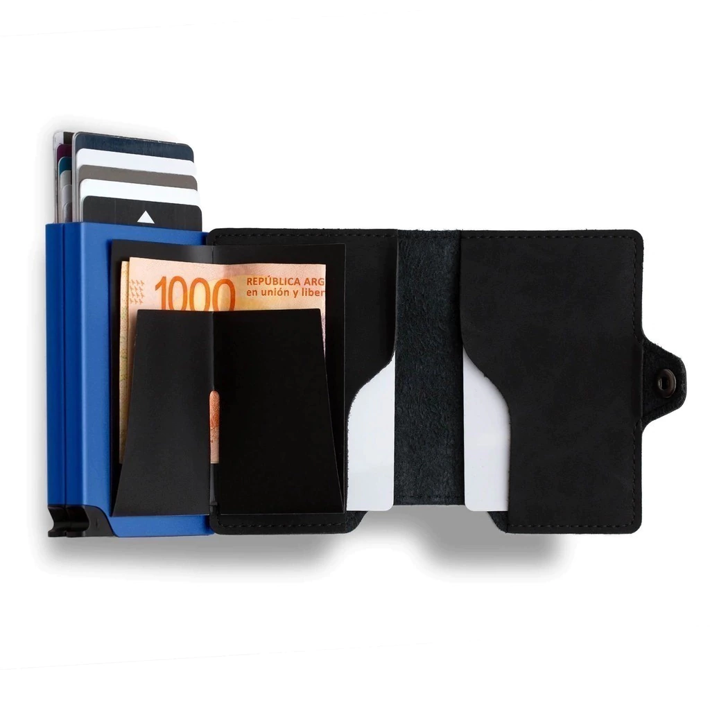 Billetera de cuero con 2 card sliders (tarjeteros) fabricados en aluminio sólido ultrafino.