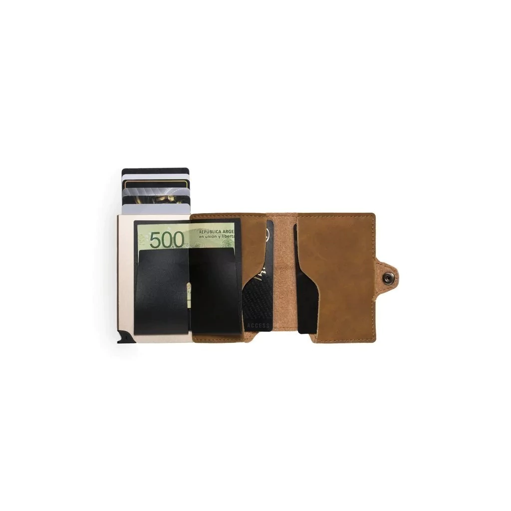 Billetera de cuero con 2 card sliders (tarjeteros) fabricados en aluminio sólido ultrafino.